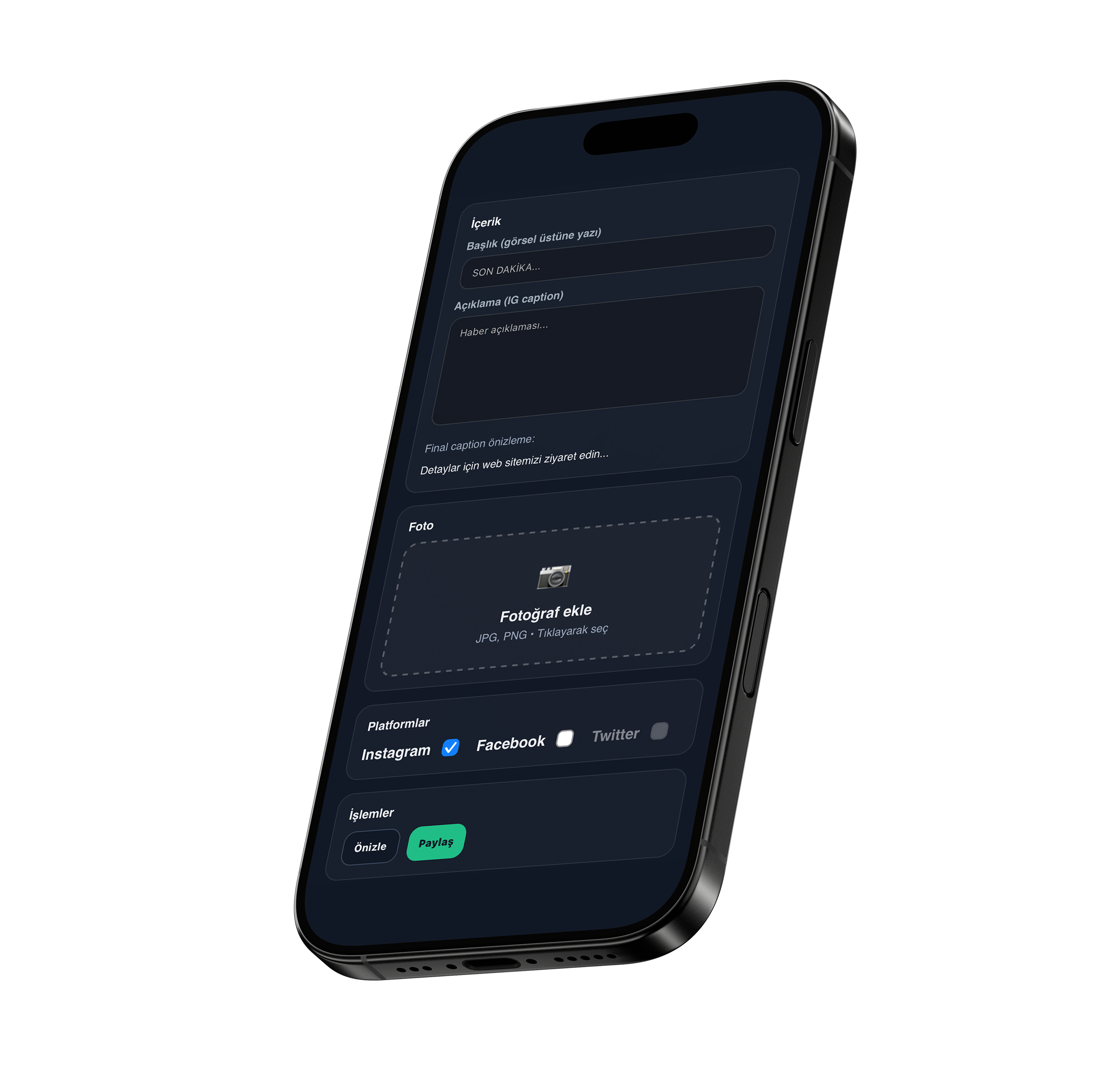 Otomatik RSS dışında da paylaşım yapabilirsin. Kullanıcı panelden fotoğrafını yükler, başlık ve açıklamayı yazar; sistem de daha önce ayarladığın şablonla görseli üretip Instagram’a gönderir.